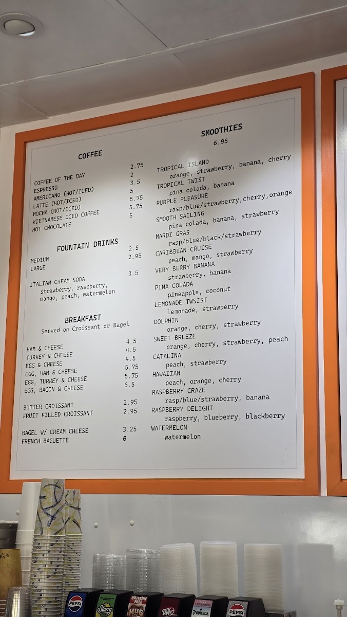 Beverage options include coffee and Italian sodas, suitable for coffee breaks or accompaniment to baked goods and sandwiches. The menu is designed to accommodate quick orders as well as casual meals, with items that can serve as light bites or filling lunch options.